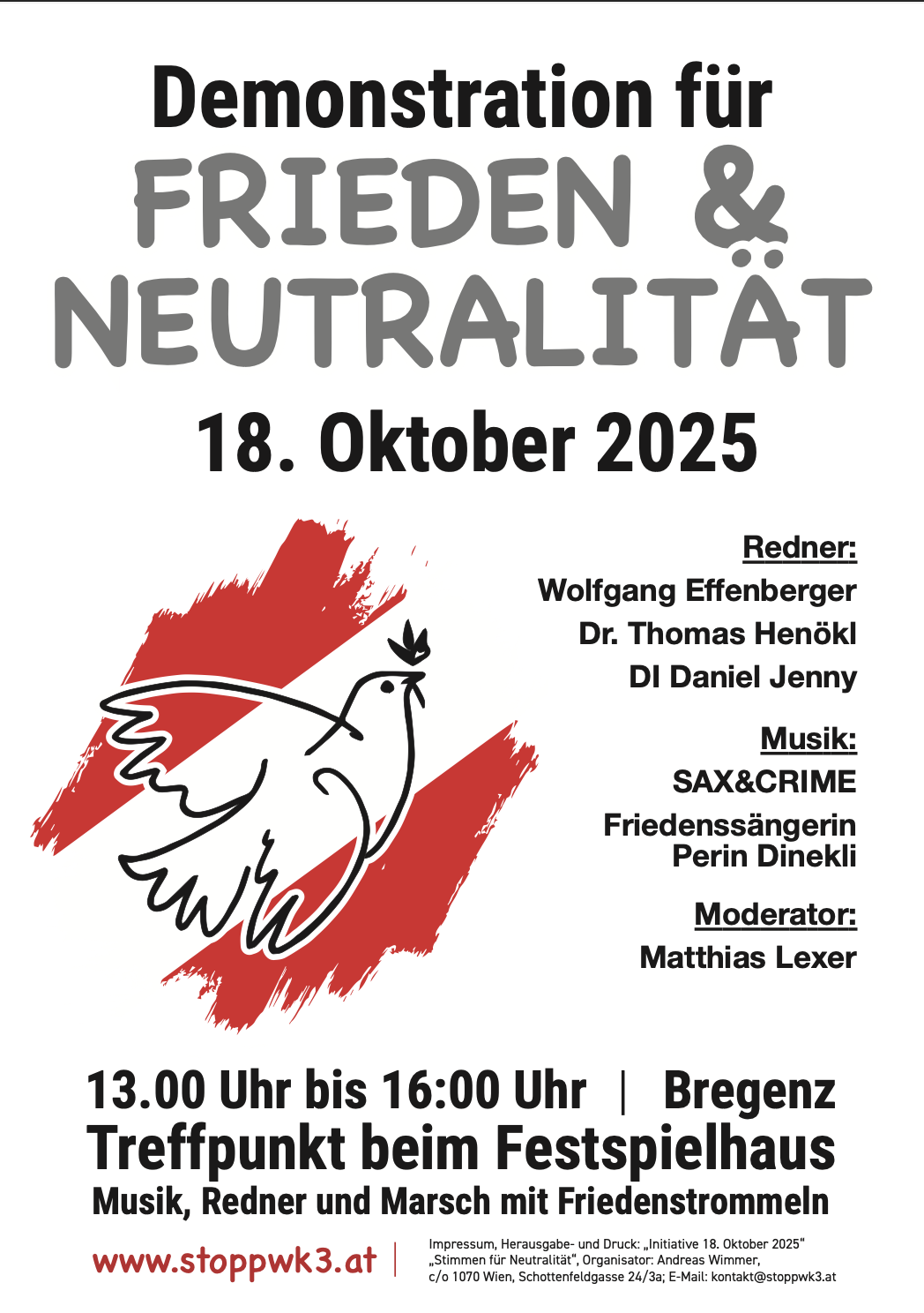 Wir freuen uns ganz besonders, dass Interessierte aus dem westlichen Österreich am 18. Oktober 2025 an einer parallel stattfindenden Demonstration in Vorarlberg persönlich teilnehmen können.
